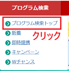 A8.netの管理画面にログインしたら、上部メニューの「プログラム検索」→「プログラム検索トップ」をクリックし、紹介したい商品・サービスを探します。