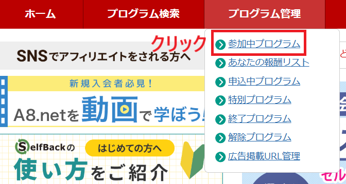 「プログラム管理」 → 「参加中プログラム」をクリック