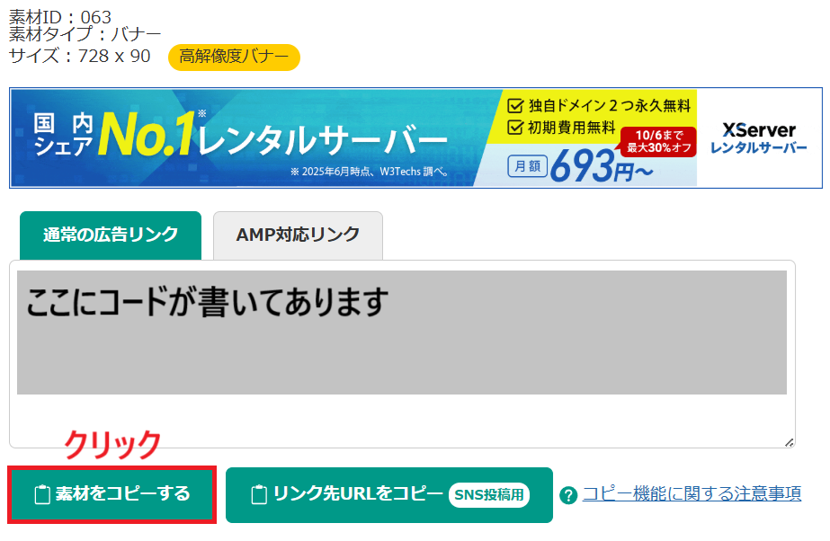 好きなバナー広告を選び、「素材をコピーする」をクリック