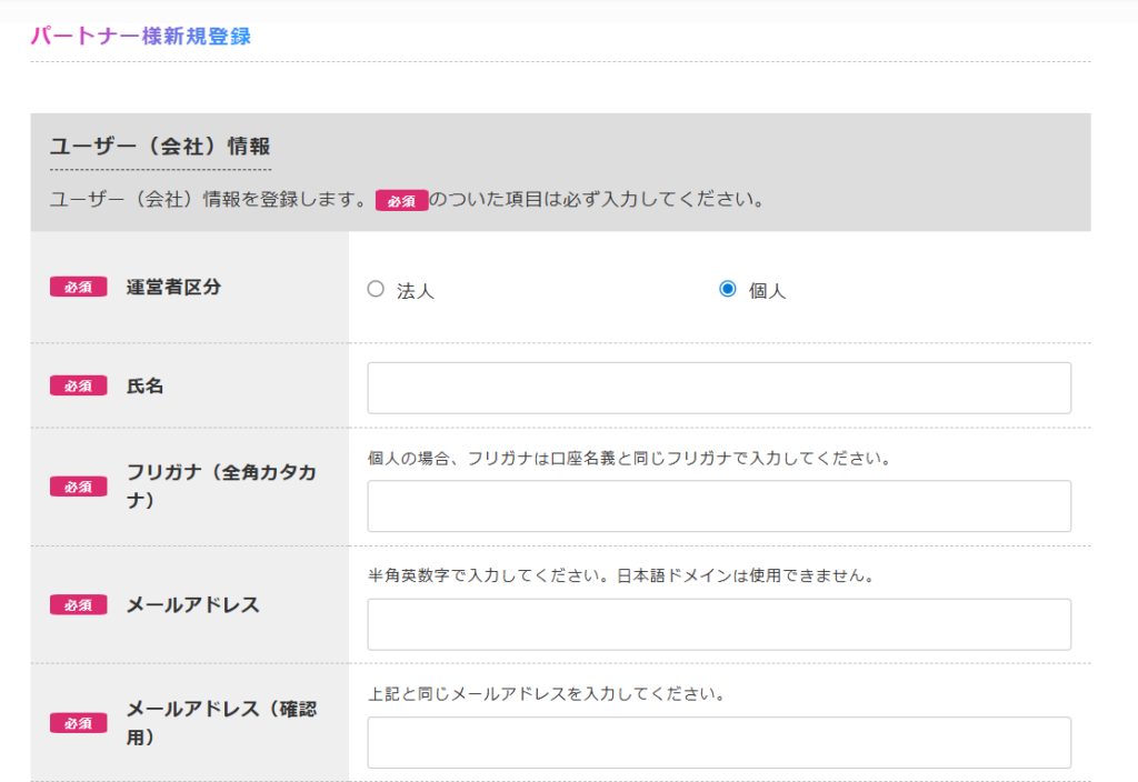 会員登録画面に進むと、まず パートナー規約の確認 を求められます。