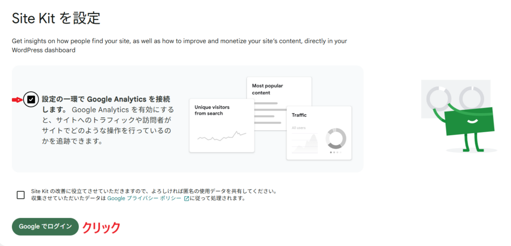 Site Kitを設定画面で「設定の一環でGoogle Analyticsを接続します」にチェックを入れる → Googleでログインをクリック