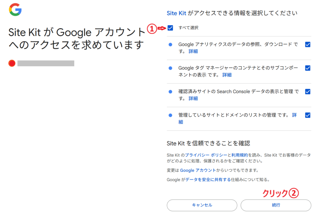「Site KitがGoogleアカウントへのアクセスを求めています」と出るので、すべてチェックして続行