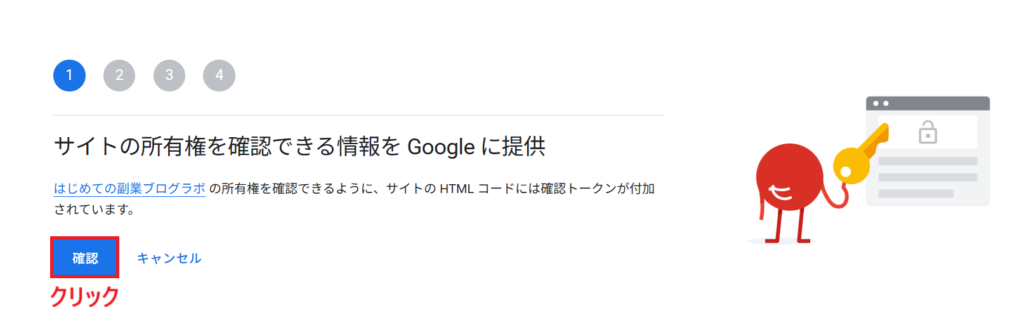 「サイトの所有権を確認 できる情報をGoogleに提供」 →  確認をクリック