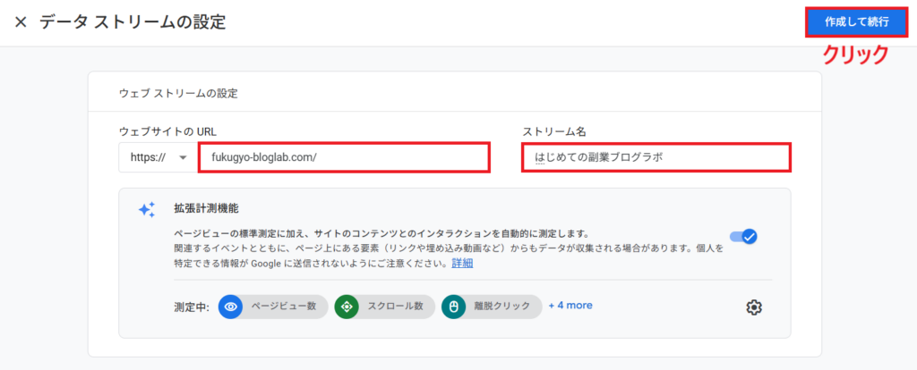 ウェブサイトのURLとストリーム名(ブログ名)を入力