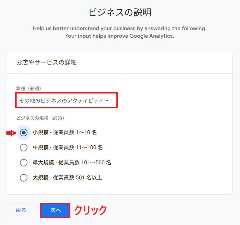業種は当てはまるものがなければ、その他のビジネスのアクティビティを選択