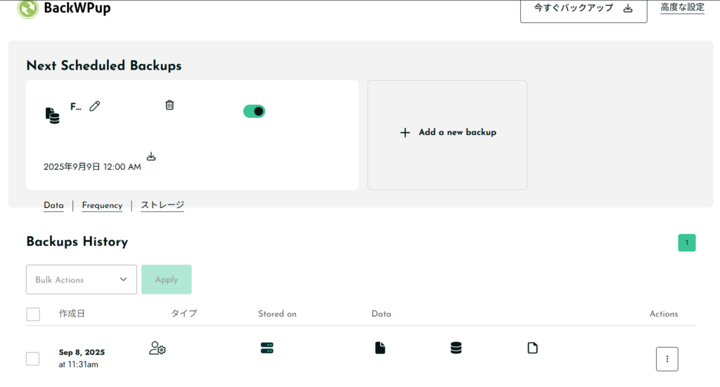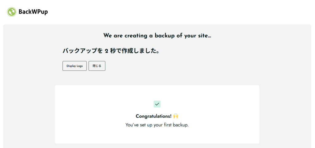 「閉じる」 をクリックすると、BackWPupのトップ画面に移ります。これですべて完了です。