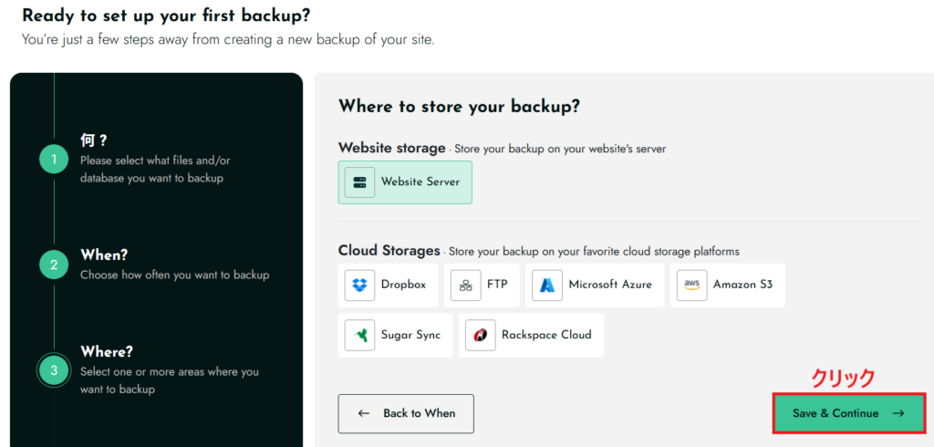 バックアップの頻度を聞かれるので、「Daily(毎日)」 に変更して 「Save & Continue」 をクリック