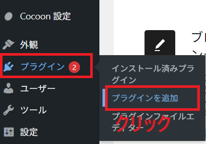 WordPress管理画面から 「プラグイン」 → 「プラグインを追加」 をクリック