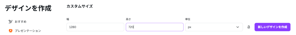 幅:1280 高さ:720 単位:px と入力