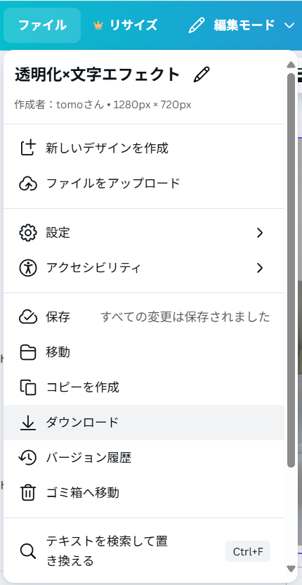 上の 「ファイル」→「ダウンロード」 をクリック