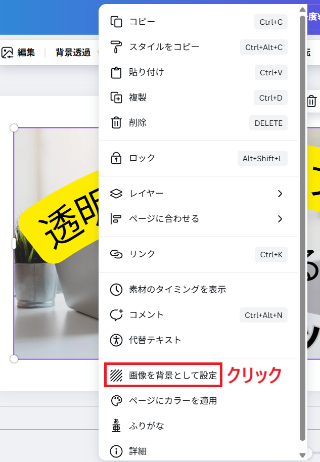 写真の位置の調整はここでおこなってください。透明化した後では調整できなくなります。