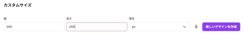 幅240・高さ240・単位pxと入力し、「新しいデザインを作成」を選びます。