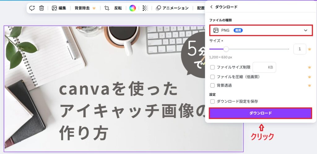 ダウンロードをクリック。ファイルの種類は PNG がおすすめです。