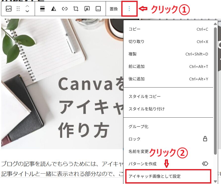 そして、そのアイキャッチ画像をクリックして選択し、「アイキャッチ画像を設定」をクリックします。