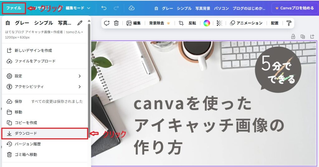 ダウンロードに編集したアイキャッチ画像が入っているので、ダウンロードをクリック。