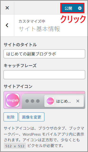 - 設定は「外観 → カスタマイズ → サイト基本情報」から数クリックで完了