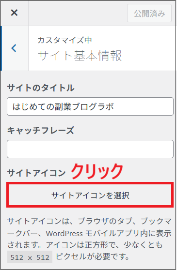 WordPressでは、ファビコン(サイトアイコン)の推奨サイズは「512px × 512px」とされています。