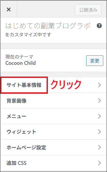 この記事では、Cocoonテーマの画面を例に説明しますが、基本的な流れは他のテーマでもほぼ同じです。