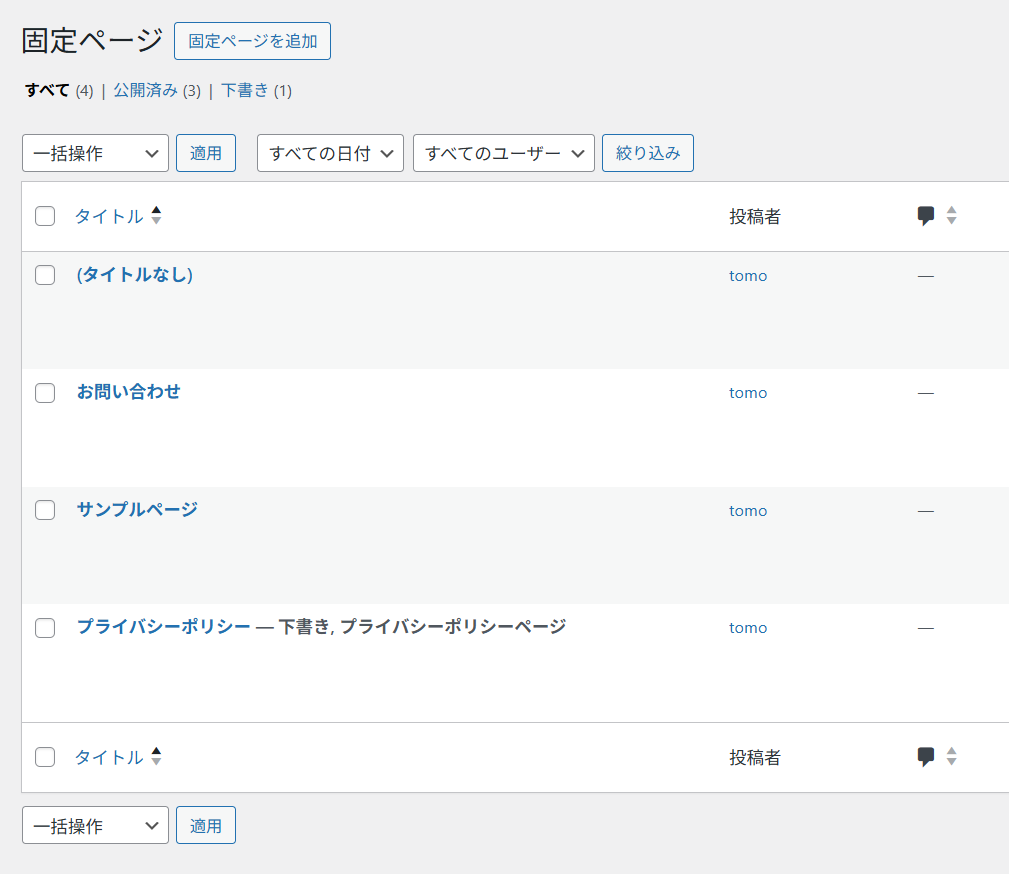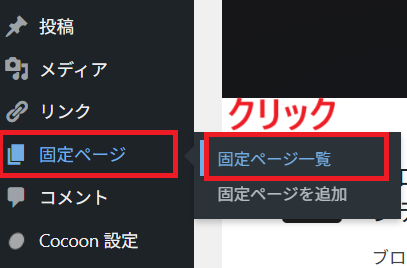 管理画面の左メニューから 「固定ページ」「固定ページ一覧」 をクリック