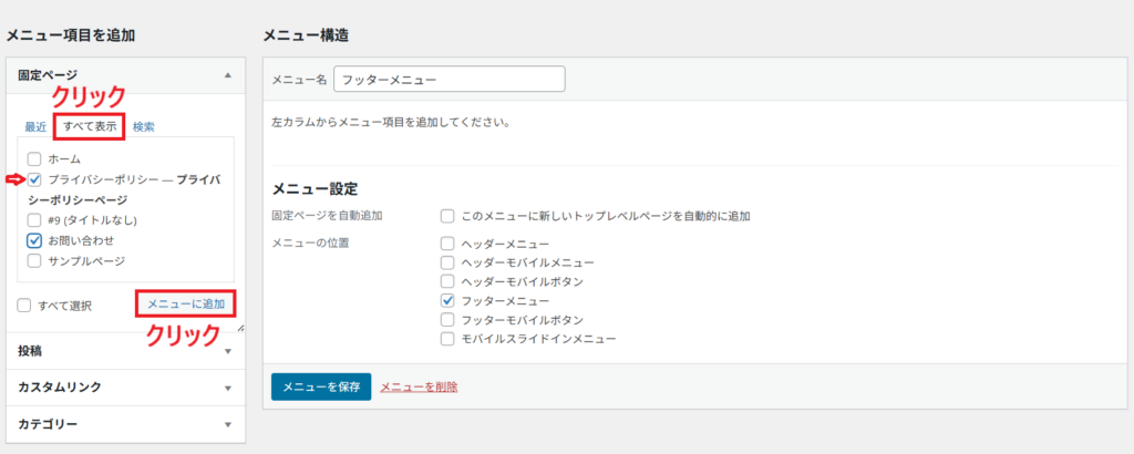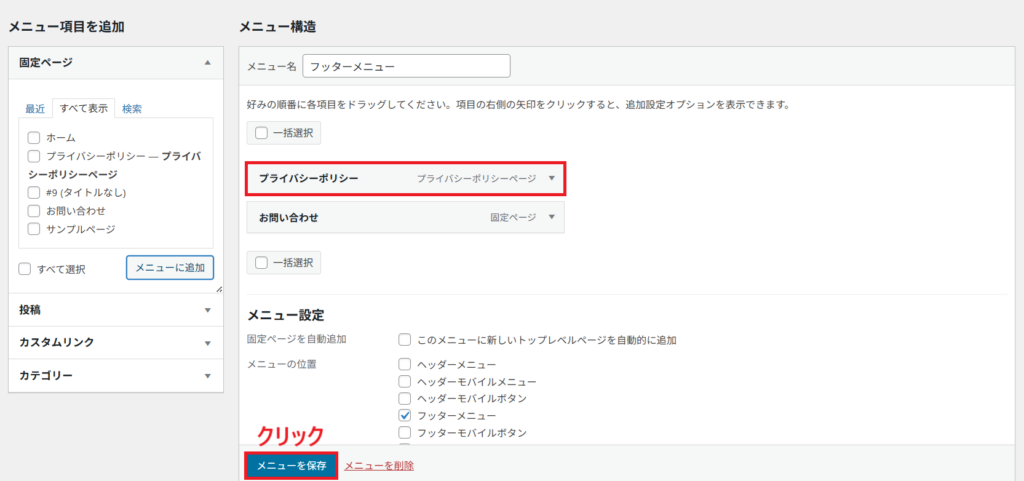 フッターメニューを作成し、プライバシーポリシーを追加して保存
