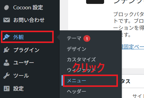 WordPress管理画面から 「外観」「メニュー」 をクリック