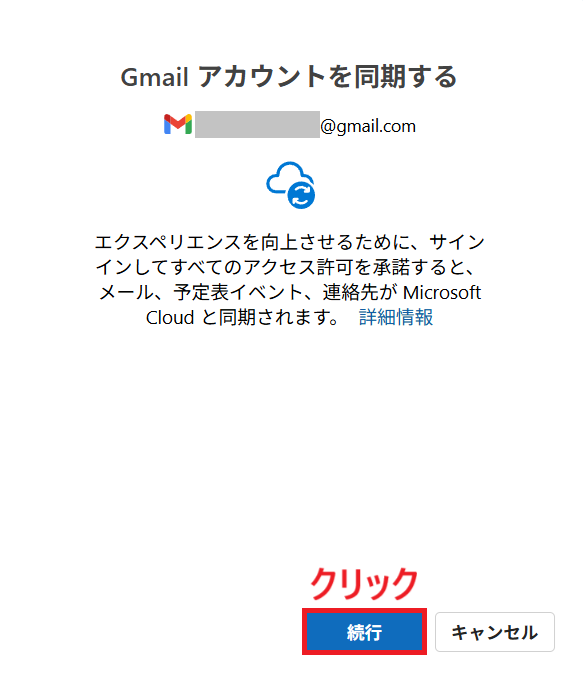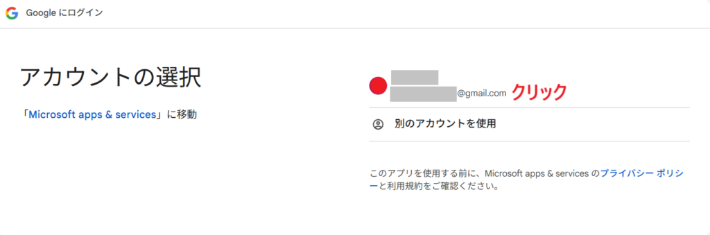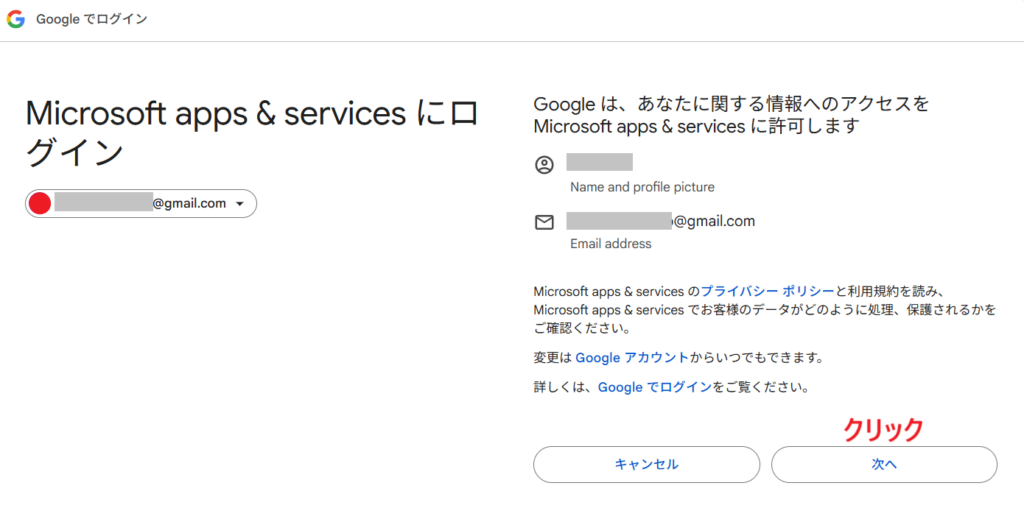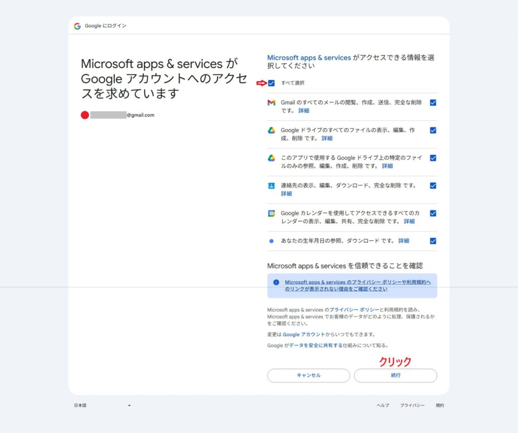 Microsoft apps & services がGoogleアカウントへのアクセスを求める画面で、すべて選択して「続行」をクリック