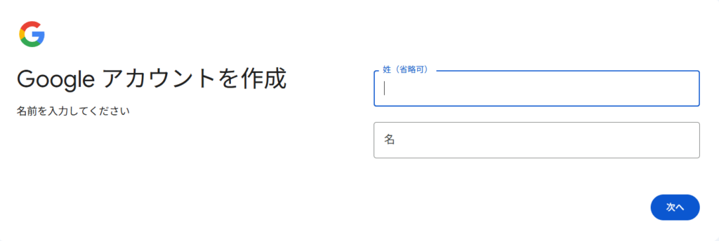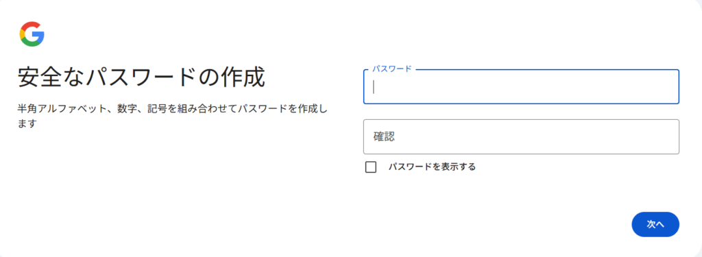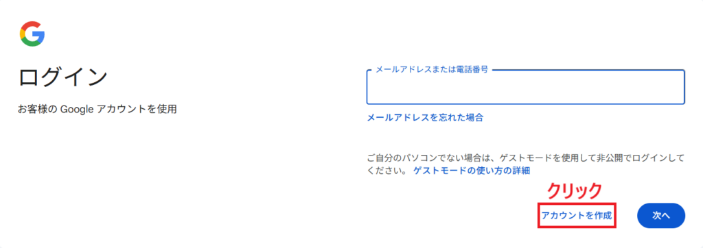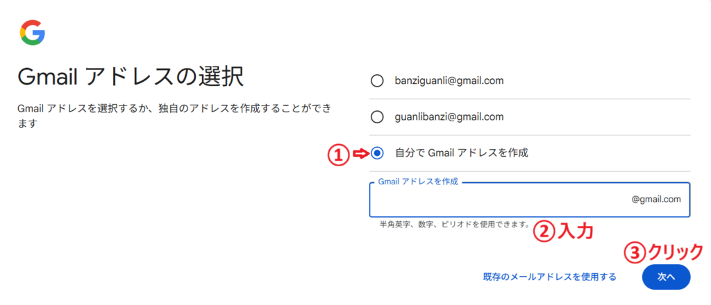 「自分で Gmail アドレスを作成」を選び、希望のアドレスを入力 → 「次へ」をクリック