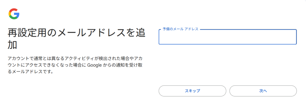 再設定用メールアドレス を追加(任意ですが、忘れたときに安心なのでおすすめ)