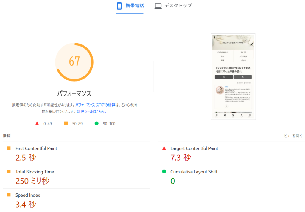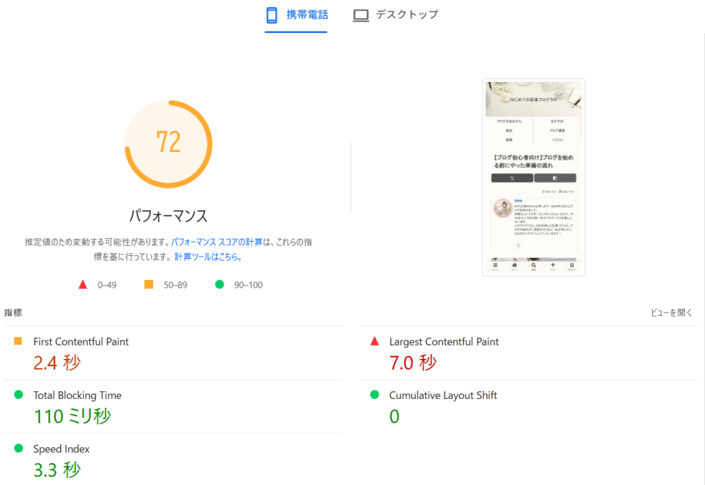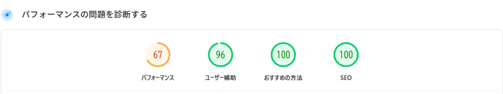 今回の結果では、レイアウトのズレ(CLS)は問題ありませんでしたが、ページのメイン要素が表示されるまでの時間(LCP)が遅く、スコアに影響していることが分かりました。
