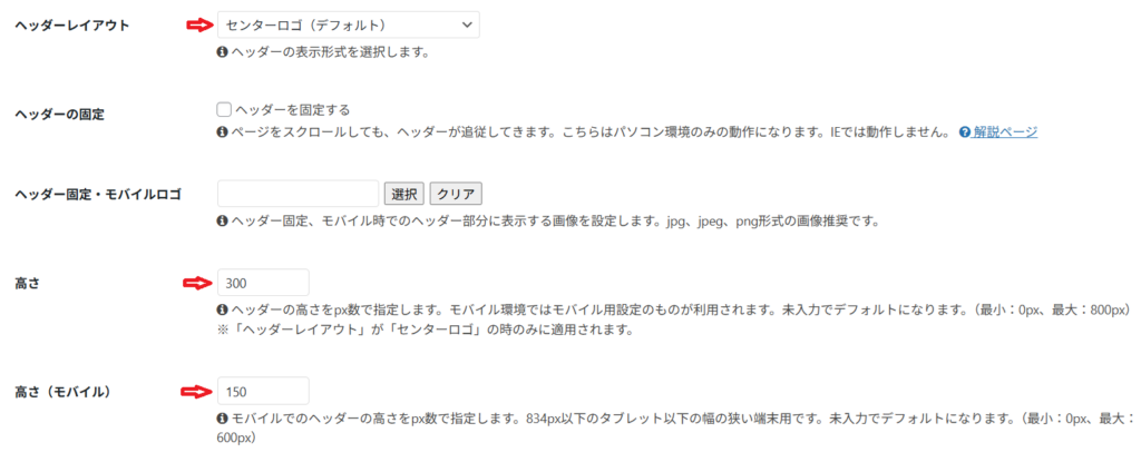 ヘッダーレイアウトは 「センターロゴ」 に設定(もちろん、好きなレイアウトでいいですよ!)