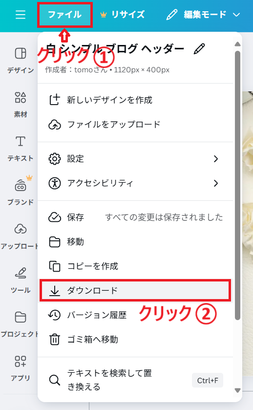 編集が終わったら 「ファイル 」→ 「ダウンロード」