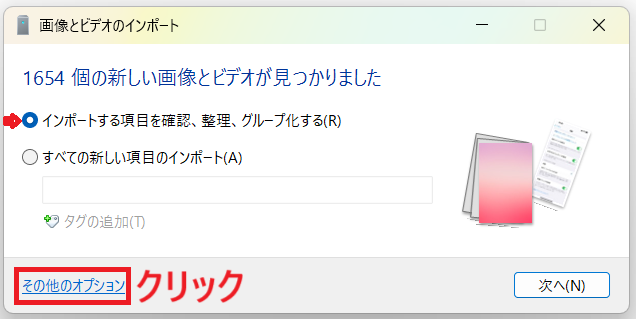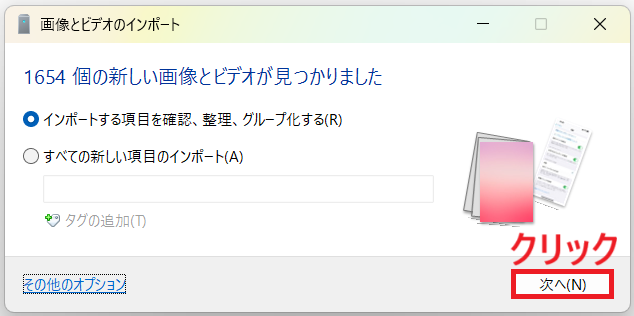 また、「画像とビデオのインポート」の画面に戻るので、次へをクリック
