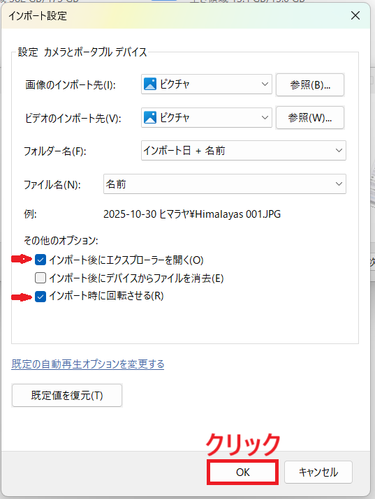 その他のオプションの2番目の「インポート後にデバイスからファイルを消去」にチェックを入れると転送後にiPhoneから写真がなくなってしまうので、チェックは外しておきます。