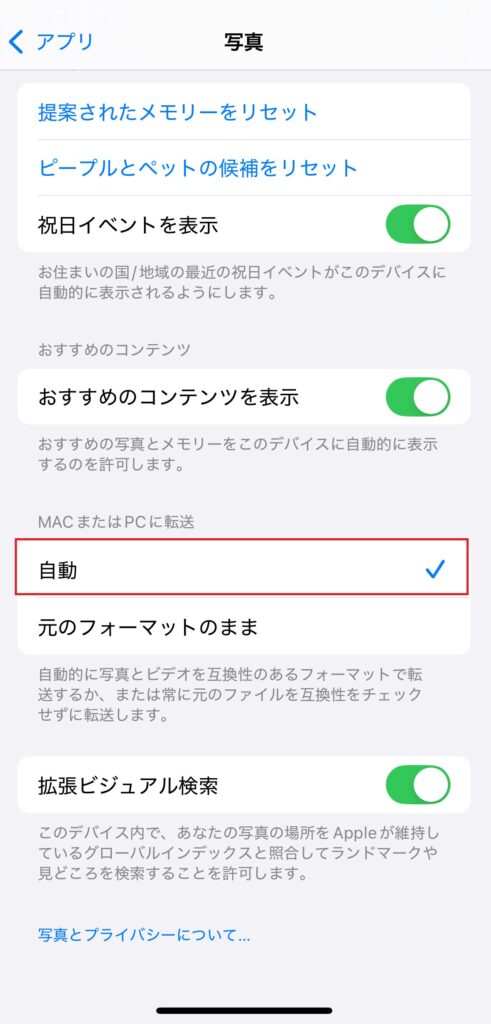 まずは、写真が正しく転送できるように iPhone側の設定をチェック します。