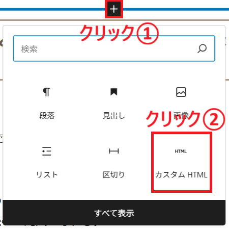 「+」ボタン → カスタムHTMLブロック を追加