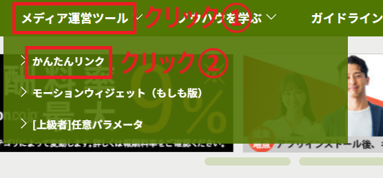 もしもアフィリエイト管理画面 → メディア運営ツール → かんたんリンク をクリック