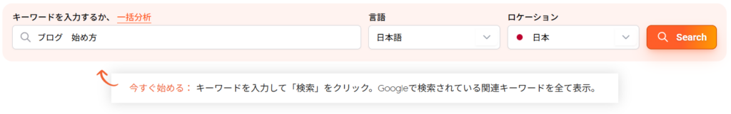 調べたい言葉(例:「ブログ 始め方」)を入力して検索。