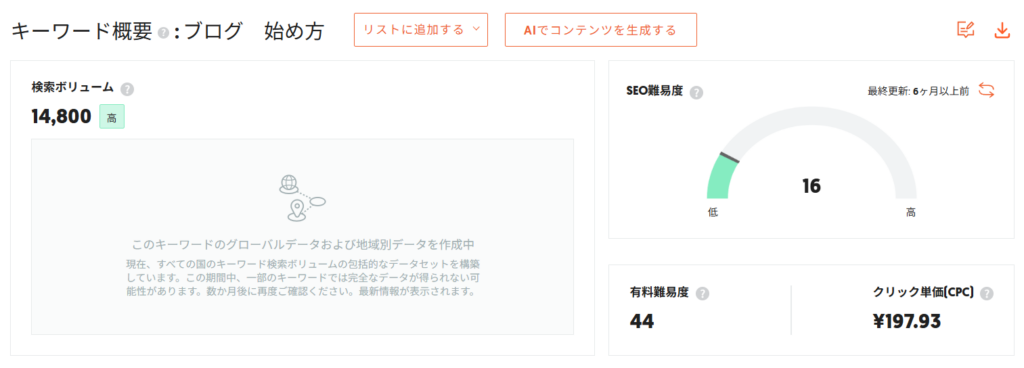 「ブログ 始め方」だと検索ボリュームが14800とかなり多いですね。なんだか競合が強そうなキーワードです。