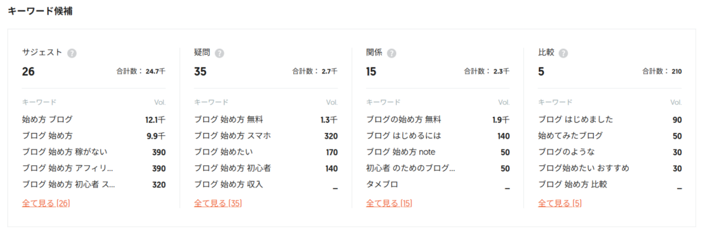 似た検索語句(例:「ブログ 始め方 初心者」「ブログ 始め方 無料」など)が一覧で出るので、記事タイトルや見出しの参考にできます。