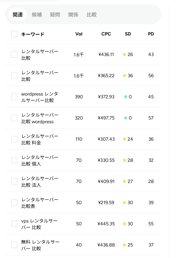 たとえば、「レンタルサーバー 比較」と検索しただけで、月間検索ボリューム(どのくらい検索されているか)